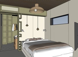 Nous proposons une combinaison de modules X-TRA (espace de vie) et T-TRA (salle d’eau agrandie), pour un total de 15,45 m² habitables. Cette configuration permet de concilier confort, sécurité et facilité de circulation. Nous avons ensuite travaillé plusieurs variantes d’agencement pour optimiser l’espace. Les parois intérieures sont en Valchromat, des panneaux de fibres de bois teinté, résistant et écologique, que nous utiliserons également pour créer les meubles de rangement sur mesure.